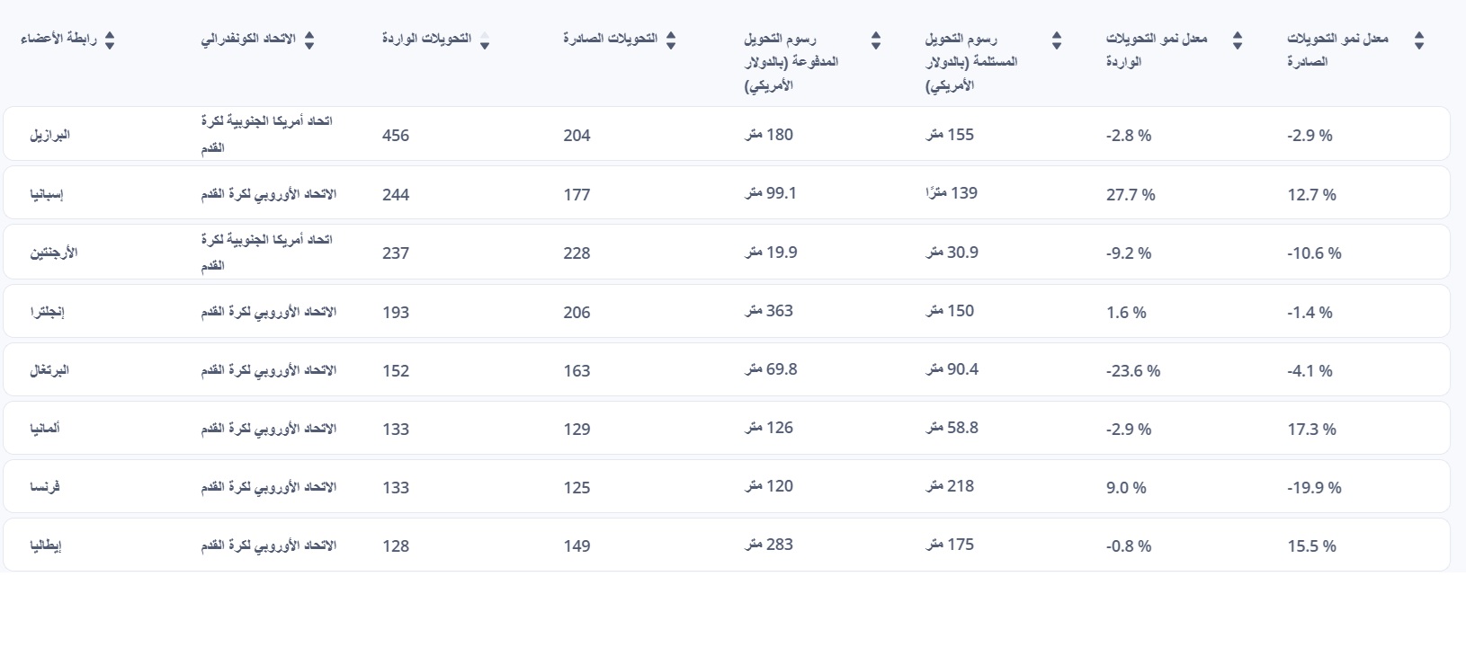 على مستوى استقبال اللاعبين.. البرازيل كانت الدولة الأولى عالميًا.. بعدها إسبانيا.. ثم الأرجنتين.. إنجلترا.. وأخيرًا البرتغال.. أما في تصدير اللاعبين.. الأرجنتين جات في الصدارة.. بعدها إنجلترا.. ثم البرازيل.. إسبانيا.. وأخيرًا الولايات المتحدة.. والأرقام دي بتأكد إن أمريكا الجنوبية لسه المصدر الأهم للمواهب.. وإن أوروبا هي السوق الأكبر للاستهلاك.
