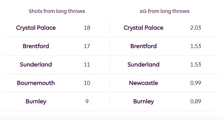 الإحصائية دي بقى بتوضح لنا مين أكتر الفرق تفوق في النقطة دي من وقت قريب من بداية الدوري.. هنلاقي إن كريستال بالاس هما الأعلى في التسديدات الناتجة من الرميات وكمان هما الأعلى من حيث الـ XG واللي هو عدد الأهداف المتوقعة الناتجة من الرميات دي.. وهتلاحظ أن أول 5 فرق في الإحصائية دي مفهمش ولا فريق من التوب 6 في الدوري وده أحد الأسباب الواضحة اللى ساعدت في إننا نشوف فريق زي كريستال بالاس إنه يبقى في المركز الـ 5 حتى الآن واللي بعده هو سندرلاند الصاعد حديثاً واللي موجود برضه في الإحصائية دي