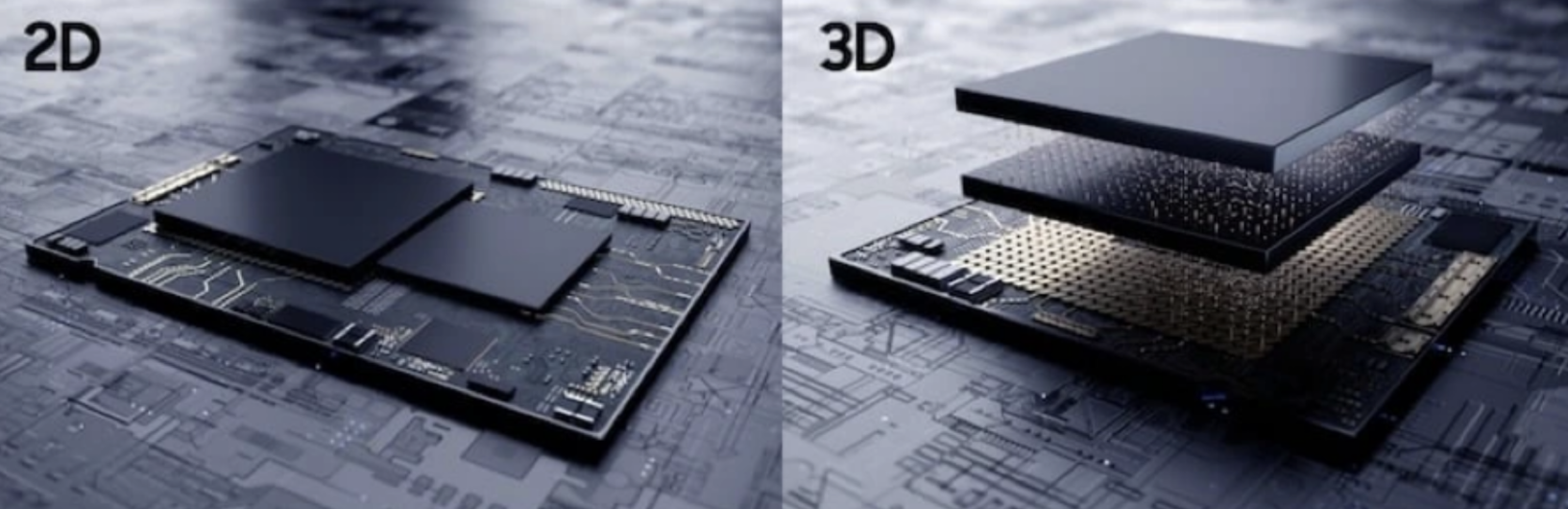 الشريحة الـ”ثلاثية” مكوناتها مرصوصة فوق بعض في طبقات عمودية, مش بس فوق سطح واحد زي الـ”ثنائية” فبالتالي سرعة التواصل بين المكونات بتكون اعلى لأن المسافة بقت أقصر.