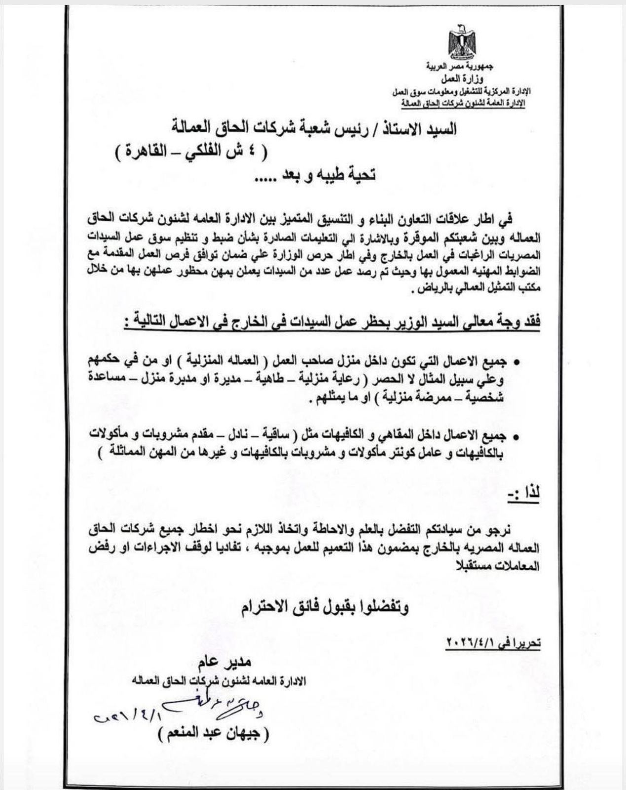وزير العمل أصدر يوم الأربعاء 1 أبريل 2026 توجيه لشركات إلحاق العمالة بالخارج بيحظر عمل السيدات المصريات في مجموعة من المهن خارج مصر.. فهنقولك إيه هي تفاصيله وبناءً على إيه صُدر القرار ده