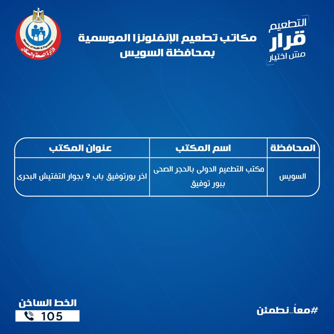 May be an image of ‎text that says '‎i5g தரிமி்ைத்த الارالم السكان பிட்படைக்நநா التطعيم قرار مكاتب تطعیم الإنفلونزا الموسمية م اختيار بمحافظة بورسعيد عنوان المكتب حجر صحى بور بورسعيد اسم المكتب شارع النهضه ومحمد علي المحافظة مكتب الحجر الصحى بميناء بور سعيد بو رسيد مكتب صحة أول بورسعيد بور رسعيد الخط الساخن خت 105 #معاَ نطمئن‎'‎