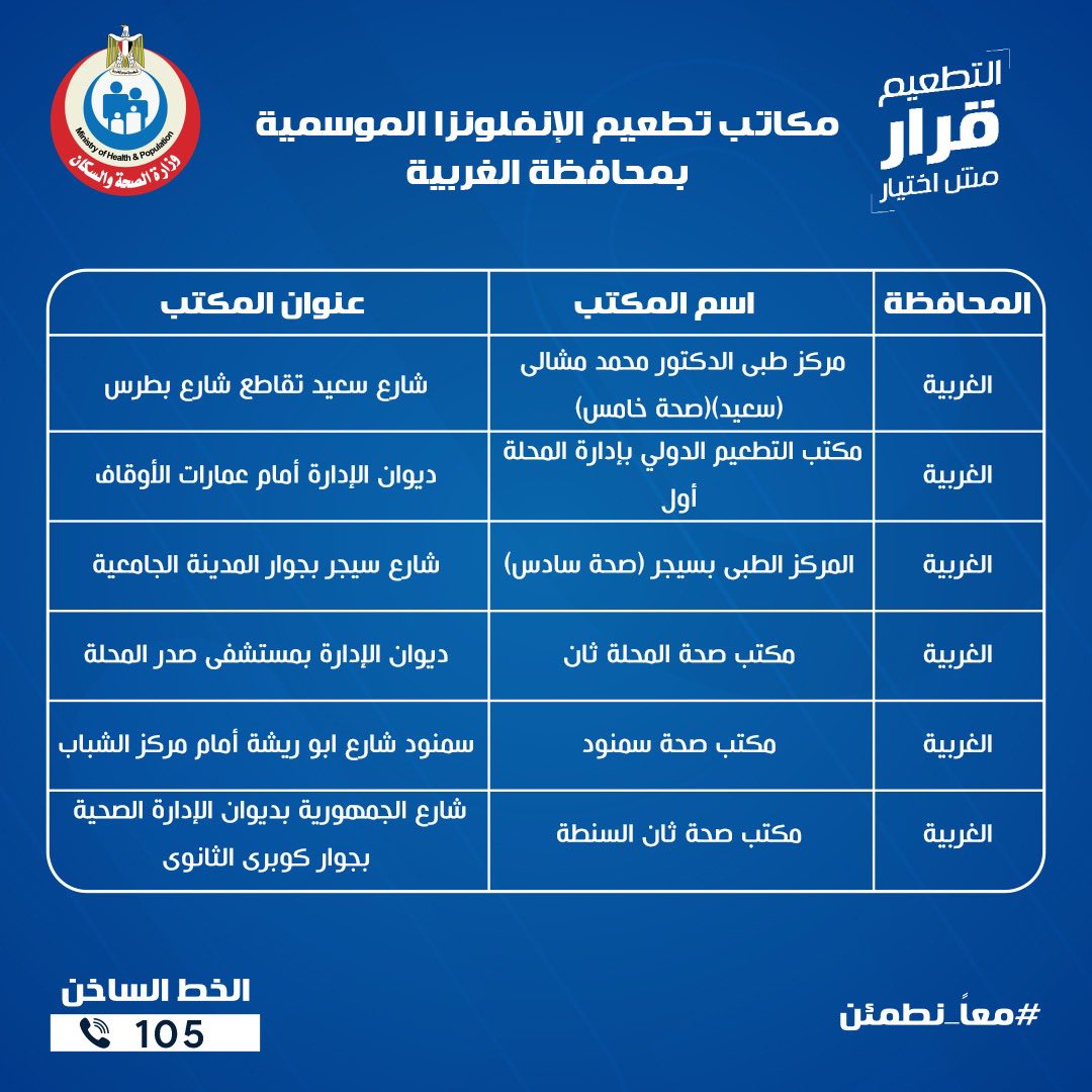 May be an image of ‎text that says '‎شارة ሀዚኢጠራምይ 心たいい រាជាគណកក្យ مكاتب تطعيم الإنفلونزا الموسمية بمحافظة الغربية التطعيم قرار مش اختيار عنوان المكتب شارع الجيش بجوار مجلس مدينة زفتی اسم المكتب المحافظة مكتب صحة زفتی مكتب صحة قطور شارع الخليج شارع المستشفى القديمة الادارة الصحية الدور الثالث رعاية الطفل ببسيون بمستشفى بسيون المركزى الغربية مكتب صحة قطور الغربية مكتب صحة أول كفر الزيات الغربية مكتب صحة اول بسيون الغربية الخط السا خن الساخن 105 معاً نطمئن‎'‎