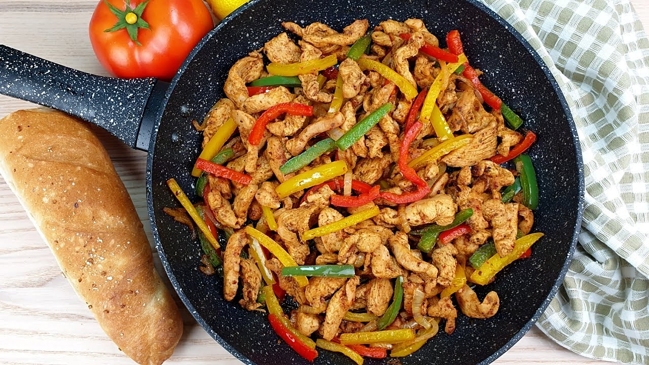 في طاسة فيها معلقين زيت سخن وعلى نار متوسطة.. حط بصلاية وفلفلاية (الالوان اللي تعبجك بقى) متقطعين شرايح وقلبهم 10 دقايق وإنزل بعد كده بالفراخ اللي تبلناها تاخد صدمة وقلبها مع الخضار.. لو عايز دلع زيادة زود جبنة موتزاريلا أو شيدر وعلى العيش وشوية مخلل ياااه.